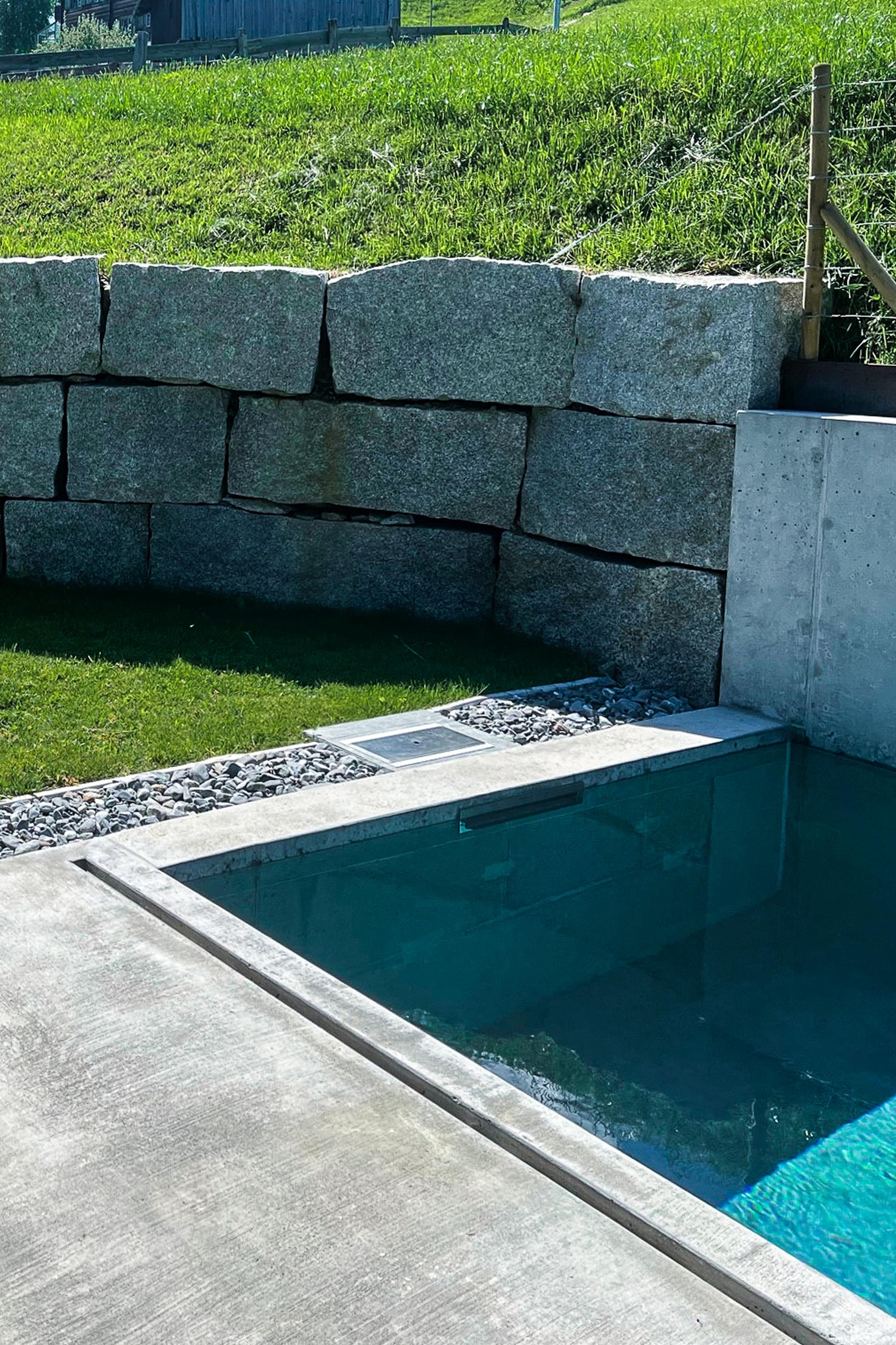 Die Gestaltung zieht sich konsequent durch alle Ebenen – von den offenen Wohnflächen über die funktionalen Nebenräumen im Untergeschoss bis hin zum Aussenbereich. Das Highlight bildet der Pool, der in Kombination mit der eindrucksvollen Aussicht ein einzigartiges Erlebnis schafft. Abgerundet wird das Konzept durch eine extra hohe Garage, die Platz für einen Camper und dessen Unterhalt bietet – ein Beispiel für die gelungene Verbindung von Design, Alltagstauglichkeit und Lebensqualität.